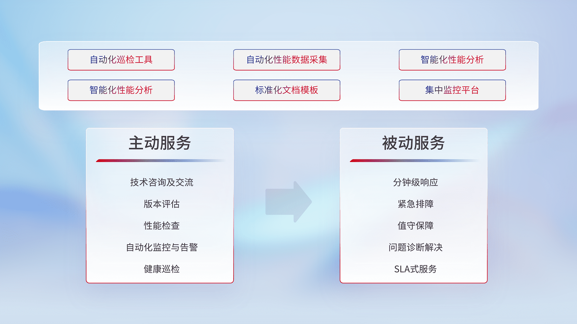 智能化工具和标准化文档,,保障服务质量,,,提供主动服务(包含技术咨询、、版本评估、、性能检查、、、、自动化监控与告警、、、健康巡检)和被动服务包含(分钟级响应、、、紧急排障、、值守保障、、、问题诊断解决、、SLA服务)。。。